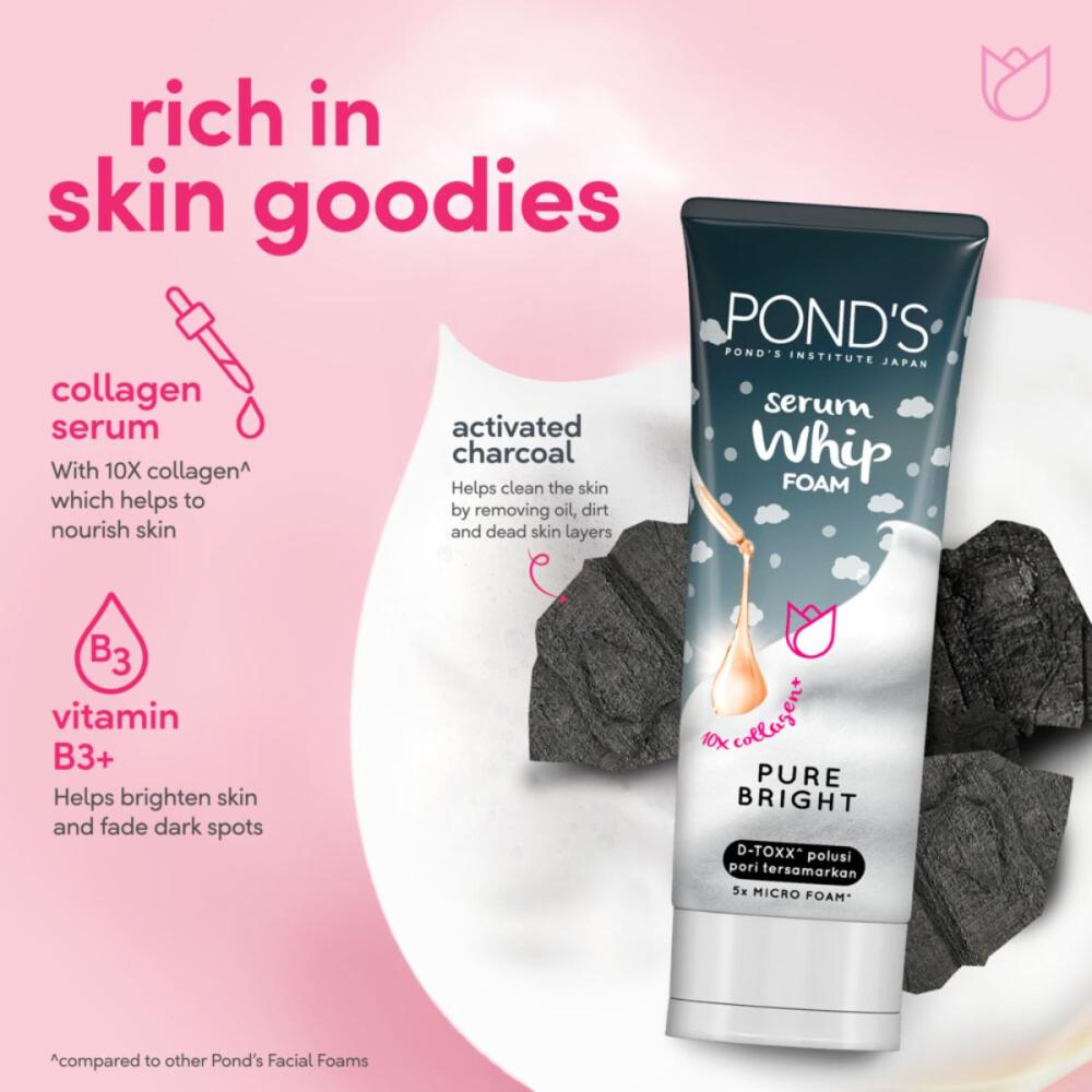 - Pond's Pure Bright Foaming Serum is packed with good things for your skin, like the serum containing 10x more collagen to help nourish the skin as well as Vitamin B3+ to help brighten the skin and fade dark spots.