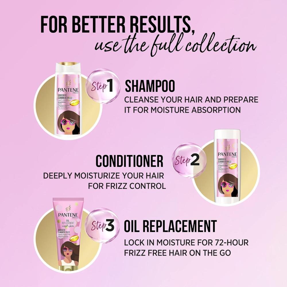 - Also try the oil replacer: For maximum protection from damage and to style your hair easily, also try the Pantene Pro-V Oil Replacement to say goodbye to summer frizzes.