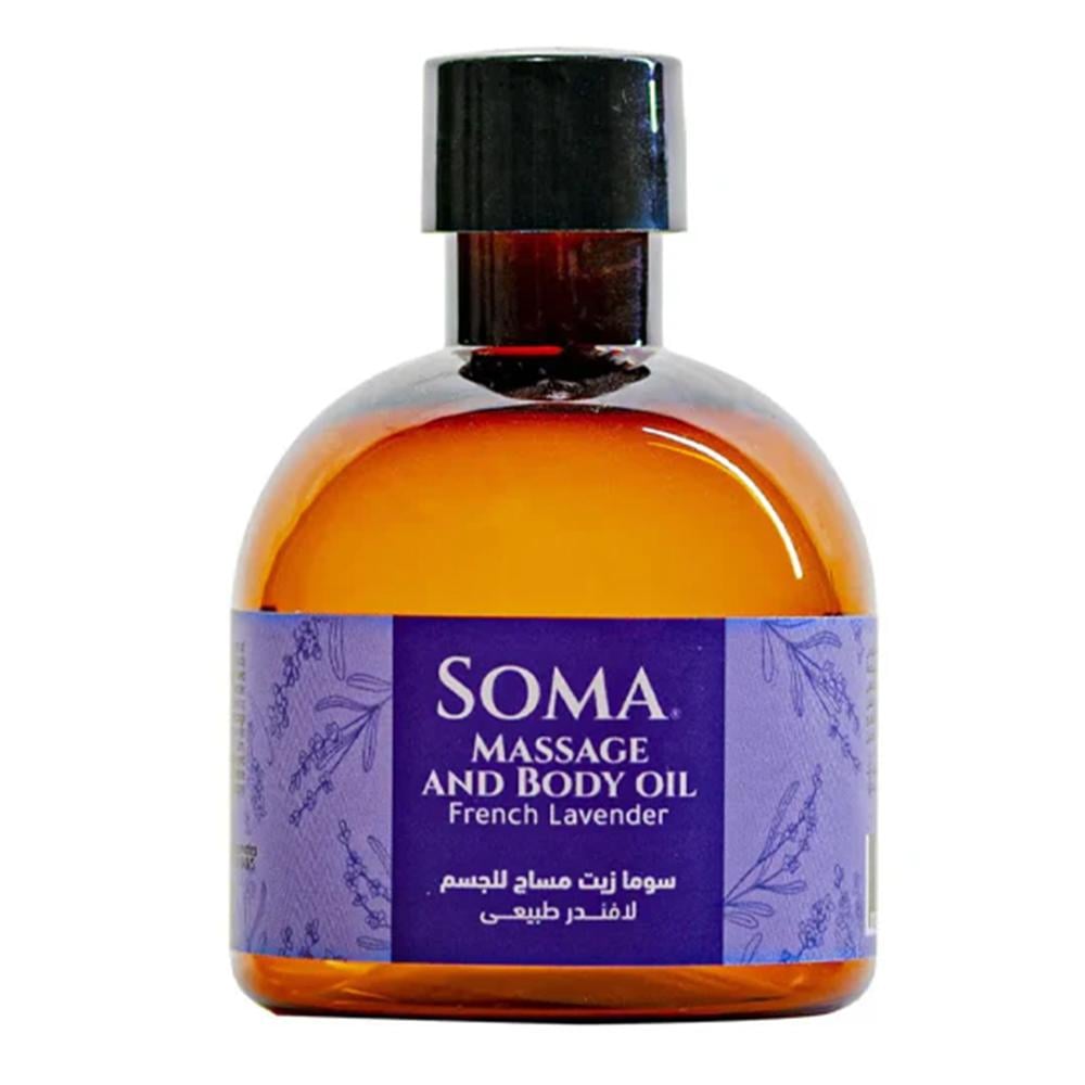 Soma Natural Lavender Body Massage Oil - 170 ml to massage and soothe the body, clear the mind, and aid sleep. It is characterized by a distinctive aromatic scent, which helps relax and enhance the feeling of comfort.