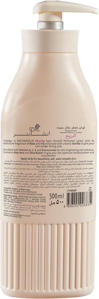 - Indulge in ENCHANTEUR Alluring Satin Smooth Perfumed Lotion with its seductive fragrance of Rose and Iris enhanced with creamy Vanilla to give your skin tender loving care.